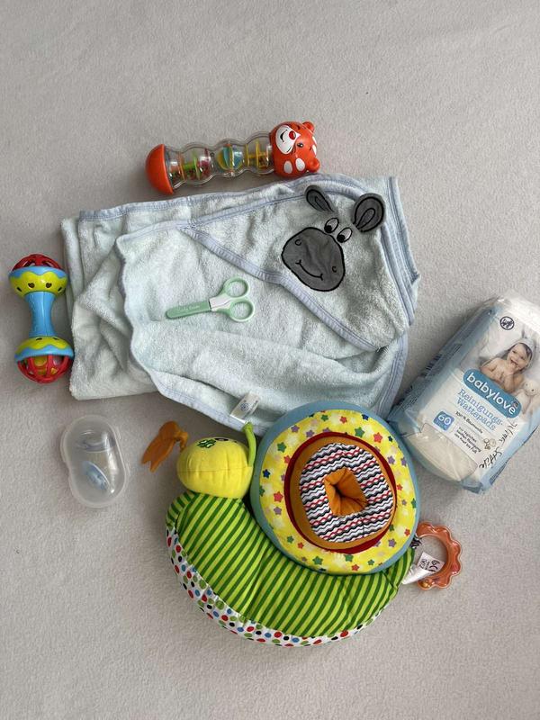 Продам одним лотом все, что на фото, состояние идеальное Полотенце для купания Две соски в контейнере Ножницы Игрушки Цена символическая! Подписывайтесь на мою страницу, обновления каждую неделю!🥳🎁❤️