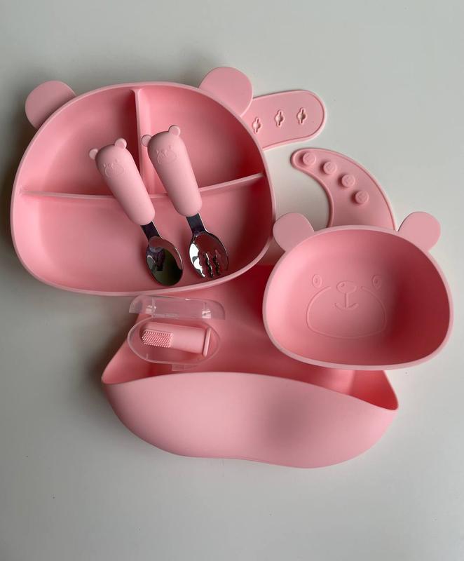 Шукаєте помічників для першого прикорму малечі? Силіконовий посуд стане в нагоді, допоможе зберегти чистоту та заохотить малечу до самостійного харчування. У наборі зібрано: - глибока тарілочка ВЕДМЕДИК на присосцi з ложечкою та виделочкою; - секційна тарілочка ВЕДМЕДИК - силіконовий поїльничок; - силіконовий нагрудник; Кольори та позиції у наборі підбираємо до Ваших побажань. Дякуємо, що обираете нас