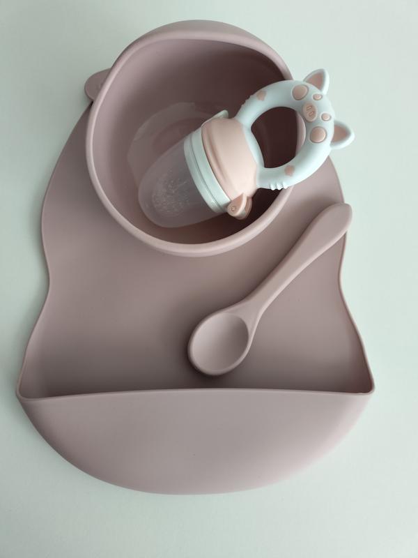 Силиконовая посуда 💯 отлично подойдет для начала горького и прослужит долго вашей малышке. ✔️Слюнявчик х кармашком. ✔️ Глубокая мысочка с ложечкой. ✔️Ниблер.