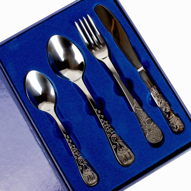 Данный набор детских столовых приборов изготовлен специально для детей, с намерением сделать пользование ими максимально безопасным. Приборы выполнены из высококачественной нержавеющей стали, имеют привлекательный дизайн и глянцевую полировку. На каждом из 4 предметов: вилке, ложке, ноже и десертной ложке нанесено изображение любимого сказочного героя, что конечно оценит каждый ребенок. Красочная упаковка привлечет детское внимание. Данный набор станет прекрасным подарком для любого ребенка. Особого ухода не требует, можно мыть в посудомоечной машине. В наборе: Нож: общая длина - 18 см; ширина ручки - 1,5 см; длина рабочей части - 9,5 см; ширина рабочей части - 2 см; Вилка: общая длина - 17 см; ширина ручки - 2 см; длина рабочей части - 5,5 см; ширина рабочей части - 2,2 см; Ложка: общая длина - 17,2 см; ширина ручки - 2 см; длина рабочей части - 6 см; ширина рабочей части - 4 см; Десертная/чайная ложка: общая длина - 14,6 см; ширина ручки - 1,7 см; длина рабочей части - 5 см; ширина рабочей части - 3,2 см