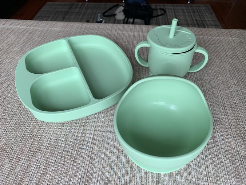 Б/у в идеальном состоянии, почти не использовали. Цвет - мятный. Секционная, супная тарелки, поильник непроливайка, такого же цвета ложечка и вилочка в комплекте. Есть слюнявчик желтый (50 грн) и ниблер новый (100 грн).