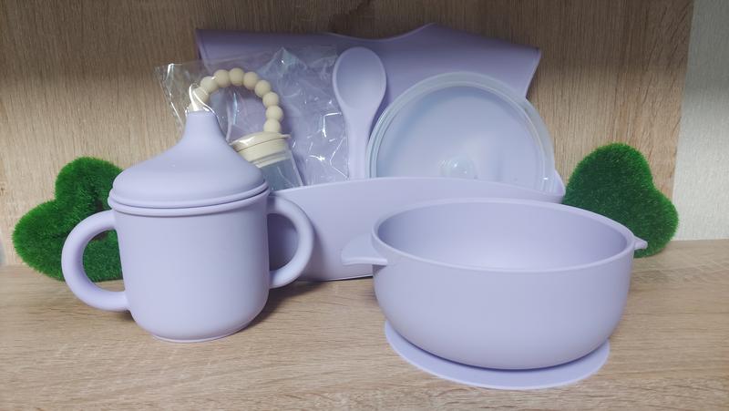 Детская посуда из качественного пищевого силикона.Е безопасен для ваших деток, удобна в пользовании.Легко моется Можно греть в микроволновой печи. -Нагрудник с карманом -Поилка анатомическая -Глубокая тарелка на присоске с крышкой и ручками -Ложка -Ниблер