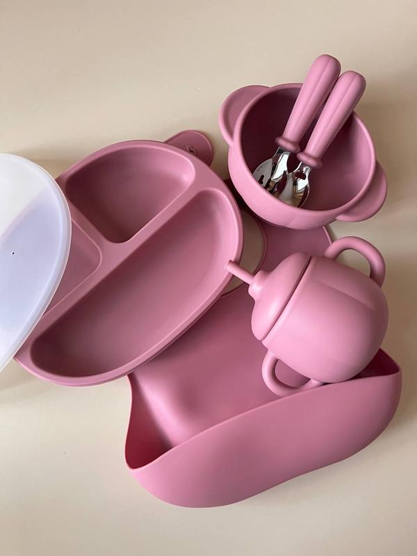 Силиконовая посуда 💯 отлично подойдет для начала горького и прослужит долго вашей малышке. ✔️Все тарелочки на присоске, очень легко крепятся к поверхности стола, что убережет ее от падения. 1.Нагрудник. 2.Поилка. 3.Секционная тарелка. 4.Кришка к секционной. 5.Глибока мисочка. 6.Ложечка. 7.Виделка.