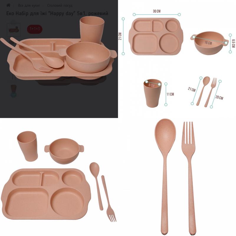 Эко набор для еды "happy day" 5в1, посуда розовый jooki, тарелочка секционная, вилка, ложк...