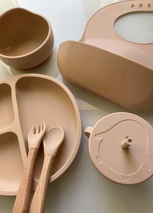 Новий набір силіконового посуду для годування дітей: - Велика секційна тарілка на присоску - Глибока тарілка на присоску - Чашка - Вилка, ложка з деревʼяними ручками - Нагрудник з кишенею Є ще варіант із снек-кришкою на чашку та приборами з силіконовими ручками Посуд виготовлений з харчового силікону, можна стерилізувати та мити в посудомийній машині, готувати їжу в духовці або в пароварці. Колір синій та голубий Деталі в дірект🌸