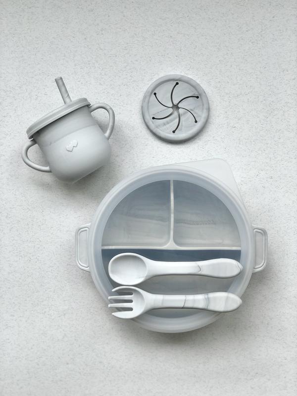 Силіконовий набір посуду: *секційна тарілка + кришка *прибори *поїльник + снек-кришка