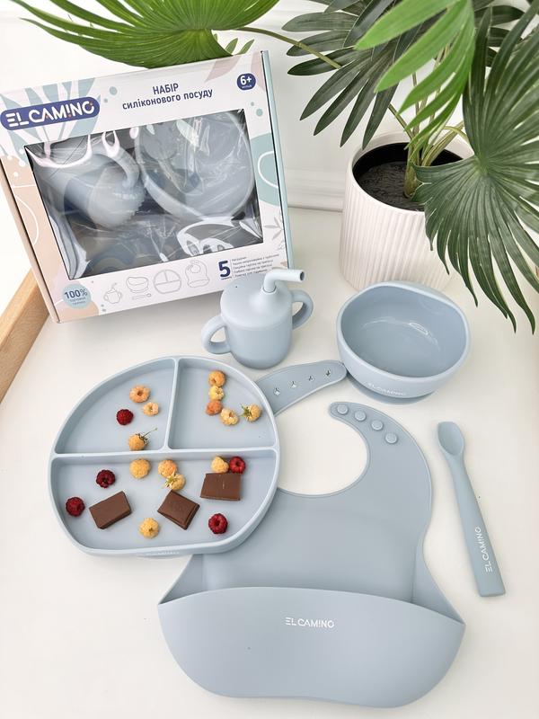 Силіконовий посуд До набору входить : Нагрудник Поїльник(+трубочка) Секційна тарілка на присосці Глибока на присосці Ложка