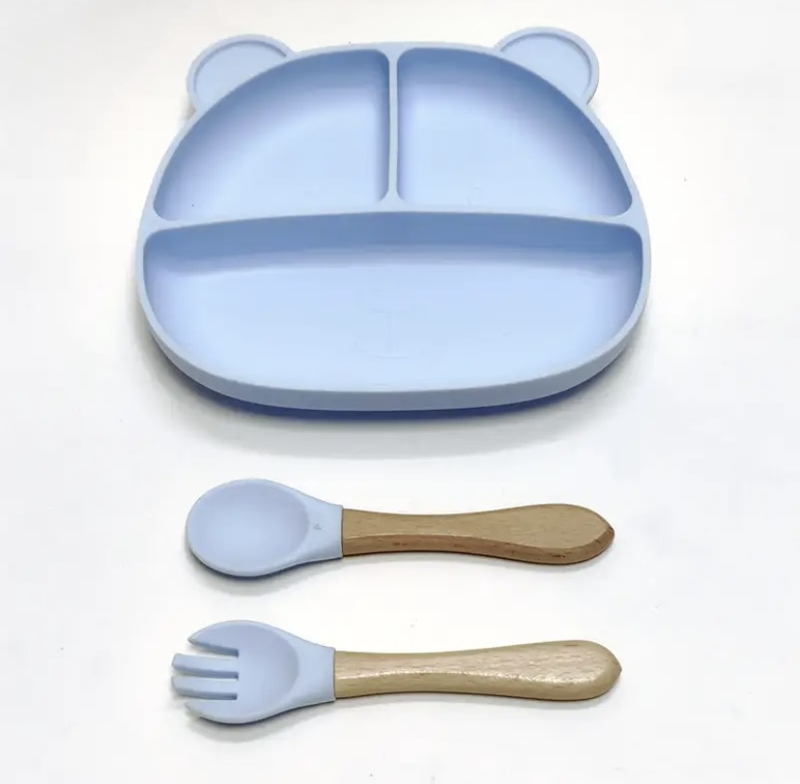 Дитяча тарілка поділена на три секції, виготовлена з гелевої рідини. Дуже легка Розміри - 18х15 Колір - Блакитний Тип візерунка - Твердий В комплекті - Виделка, та ложка. Не містить BPA (бісфенол-А). При виробництві посуду використовуються натуральні барвники. Колір - Блакитний, Жовтий, Хакі
