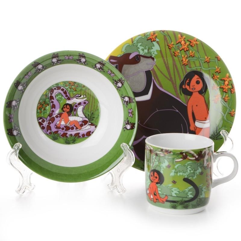 Набір дитячого посуду. Складається з трьох предметів: глибокої тарілки, мілкої тарілки і кухлика. Всім батькам відомо, що у кожного малюка повинен бути власний посуд. Перш за все, це обумовлено правилами гігієни. Однак сьогодні дитячий посуд розробляють таким чином, щоб він був зручним саме для дитячих пальчиків і привабливим саме для дитячих очей. Ми впевнені, що це зробить їжу малюка смачніше, а сніданок, обід або вечерю - цікавіше. Ось чому наша компанія спільно з італійськими партнерами випустила лінію дитячого посуду. Її форма спроектована таким чином, що навіть найменшим діткам буде зручно тримати тарілочку або кухлик. Об'єм розрахований на дитячі порції. На предметах посуду зображені герої мультфільму «Мауглі» за мотивами повісті Редьяда Кіплінга. При виготовленні посуду були використані виключно натуральні і безпечні матеріали. У наборі 3 предмети: тарілка, діаметр - 18 см; миска, діаметр - 15 см; чашка, об'єм - 230 мл.