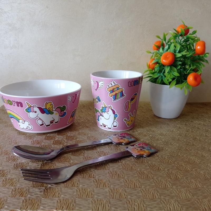 Набор детской посуды в идеальном состоянии. Глубокая тарелка, чашка, отелка и ложка.