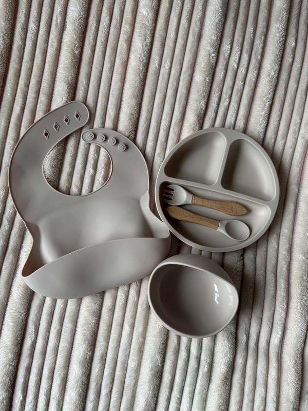 НАБОР СОСТАВЛЯЕТСЯ ИЗ: - секционная тарелка на присосках; - глубокая тарелка полусфера на присоске; - ложечка; - виделка ; - нагрудник однотонный;