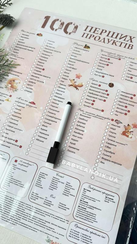 Магнитный планер 100 первых продуктов для первого прикорма поможет мамочке сбалансировать детский прикорм и разнообразить его🌿🤍 Удобный для использования- в комплекте идет маркер с резинкой для коррекции меток Он поможет планировать введение новых продуктов для малыша: -100 продуктов -отдельно выделены аллергены и обозначены буквой «А» для вашего спокойствия -запрещенные продукты в зависимости от возраста детки -скрепляющие, слабительные продукты -разрешенные специи и масла -легко отмечайте введенные продукты маркером -отдельное место для записи введенных продуктов, которых не имеет таблицы -размер А3(40*30см) -магнитное основание для крепления на холодильник или другую металлическую поверхность