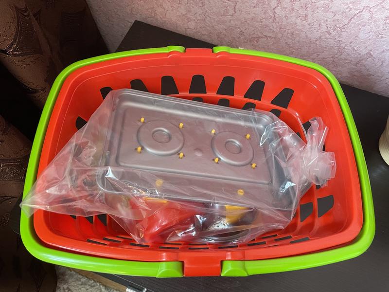 Яскравий пластиковий набір посуду в корзини.