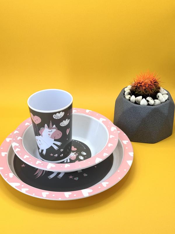 Кожен прийом їжі стане особливим, якщо додати до нього трішки магії🥰 Цей чудовий набір посуду з єдинорогом створений для того, щоб приносити радість і дарувати посмішку! Яскраві кольори, ніжні деталі та казковий дизайн створюють гарний настрій, наповнюючи атмосферу затишком і теплом❤️ Ідеальний для маленьких принцес, які вірять у дива та мріють про чарівні пригоди✨️ Набір дитячий Єдиноріжка 3 пред. стакан 200мл, глибока тарілка діам.16см, столова тарілка діам. 21см, пластик