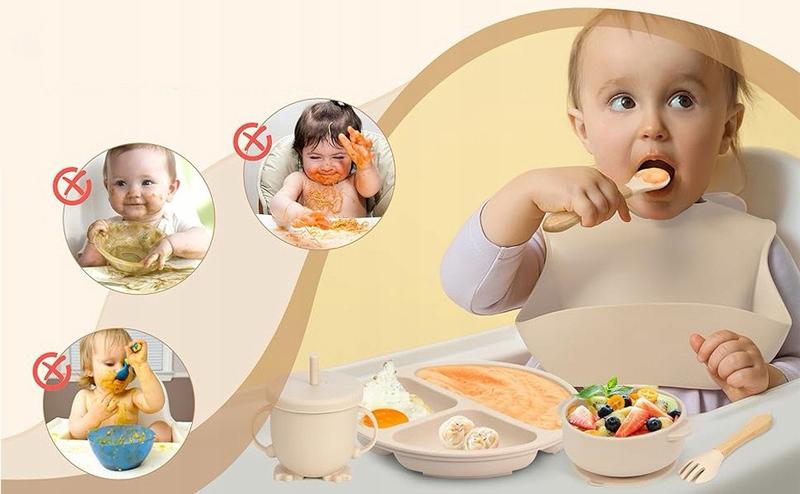 Идеальный комплект для малышей, которые делают первые шаги к самостоятельному питанию! Все предметы набора выполнены из мягкого, безопасного силикона, не содержат BPA и легко моются. Состав набора: - Нагрудник с кармашком - предотвращает загрязнение одежды, собирая крошки и капли пищи. - Мягкие ложка и вилка - удобны для маленьких ручек, безопасны для десен. - Секционная тарелка на присоске - помогает разделить блюда, сохраняя порядок на тарелке. - Глубокая тарелка на присоске - надежно фиксируется на поверхности, исключая случайные опрокидывания. - Поильник-непроливайка с трубочкой и ручками- удобен для обучения малыша пить самостоятельно без разливов. Данный набор изготовлен из 100% пищевого силикона, без вредных примесей. Его можно стерилизовать, мыть в посудомоечной машине и хранить в холодильнике. Идеальный подарок - практичный и стильный комплект для первых кулинарных приключений малыша.