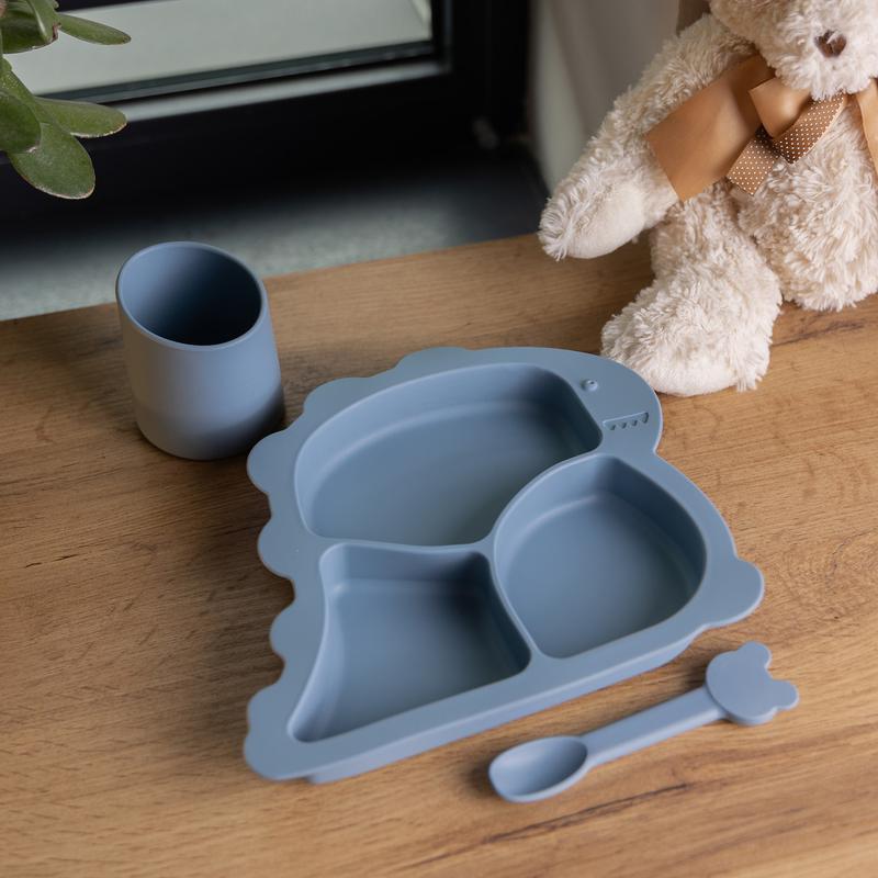 Набор детской силиконовой посуды динозавр 3 предмета тарелка с присоской, ложка и стакан д...