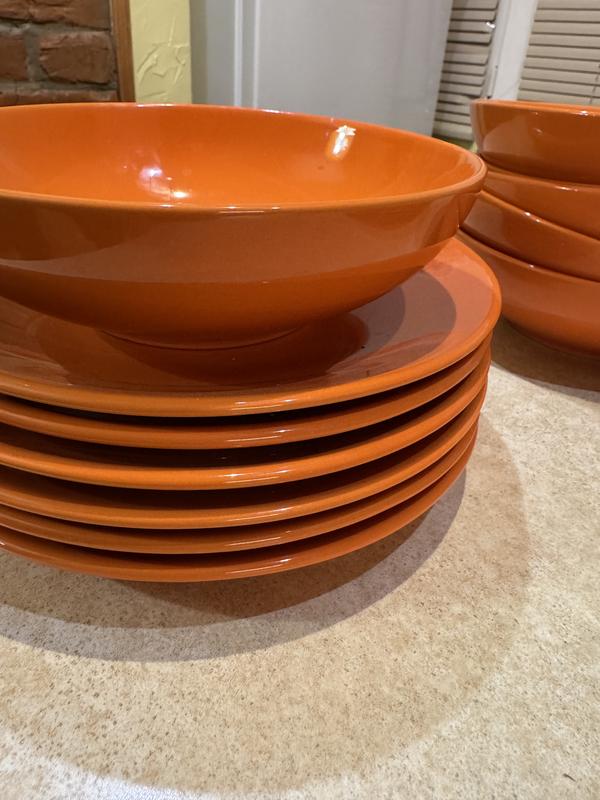 Стильний набір посуди складається з 18шт тарілок ярко апельсинового кольору.В набір входять 6шт глубоких тарілок для першої страви,6шт тарілок великих для другої страви й 6шт десертні