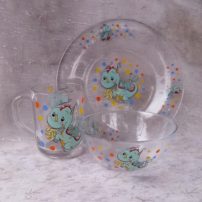 Детский стеклянный столовый набор "Дракончик" укомплектован 3 предметами - чашка, глубокая тарелка и мелкая тарелка. Набор изготовлен из качественного, прочного стекла и имеет замечательный декор, который порадует Вашего ребенка и сделает завтрак, обед или ужин приятным и интересным. В набор входит 3 предмета: - тарелка мелкая диаметром 19,5 см; - тарелка глубокая диаметром 13 см; - чашка объемом 230 мл. Такому яркому и красочному набору ребёнок всегда будет рад, а приём пищи будет для него особенным. Такая посуда незаменима в период роста и развития ребёнка. К тому же стекло отменного качества, из которого изготовлена эта посуда - это очень практичный и экологически чистый материал, а качественно нанесённый рисунок выполнен из абсолютно безопасных элементов. Также легко моется в посудомоечных машинах.
