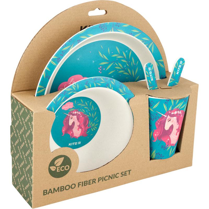 Набор состоит из пяти предметов: глубокая и мелкая тарелки, чашка, ложка и вилка. Сделан из натурального, экологического материала — безопасен для употребления пищевых продуктов и напитков, имеет антибактериальные свойства, не впитывает запахи. Цвет не тускнеет после длительного использования. Подходит как для горячих, так и холодных напитков. Не использовать в микроволновке! Можно мыть в посудомоечной машине — прошел испытания 50 циклов. Рекомендован щадящий режим. Дизайн в стиле "Lovely Sophie".