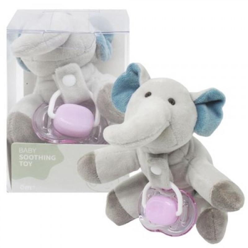 Милая мягкая игрушка в виде слоника, к которой при помощи удобной петельки на кнопочке крепится пустышка. Пустышка в комплекте, размер: 5х4 см. Игрушка будет прекрасным украшением для интерьера и практичным аксессуаром. Размер слоника: 15х12х9 см.