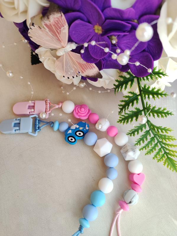 Держатель для пустышки или грызунка Такой индивидуальный аксессуар точно не останется без внимания Учтаю все ваши пожелания при сборе изделия ▫️ Пищевой силикон ▫️Безопасный ▫️Не токсично, не имеет вкуса и запаха ▫️Гнучкий ▫️Невозможно прокусить или курить ▫️Можно мыть, кипятить замораживать, при этом форму не теряет ▫️Уменьшает болевые ощущения при прорезывании зубов ▫️Развивает мелкую моторику рук ребенка, так как бусины разных форм ▫️Хороший подарок на любой праздник. Имеет в комплект еще грызуны по 150 грн +подарочная упаковка *цены могут меняться от элементов и букв грызунов (как в большую так и в более меньшую сторону)