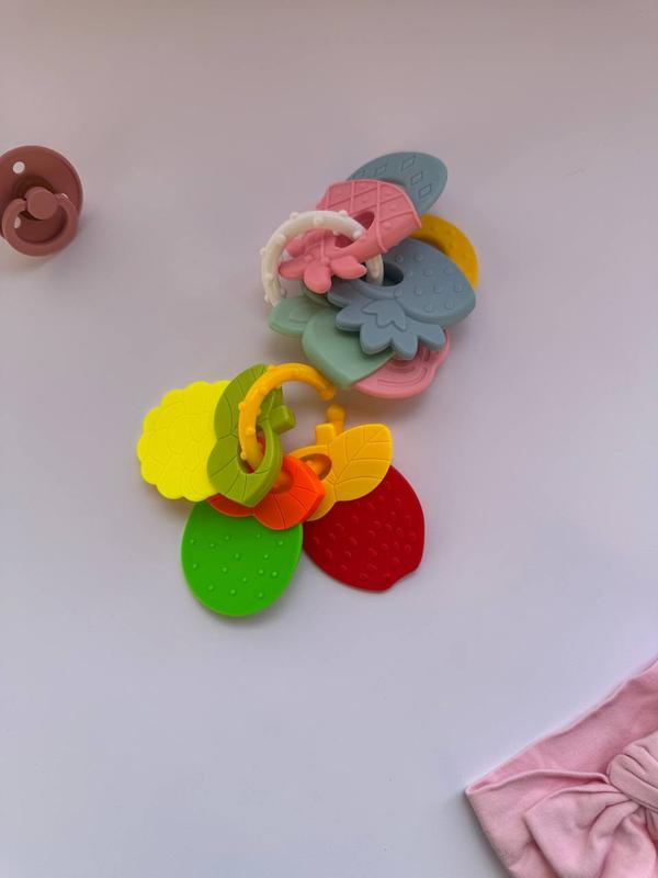Прорезыватель Детский прорезыватель в виде фруктов и ягод. Описание: • Материал: мягкий силикон, безопасный для малышей. • Дизайн: набор цветных элементов в виде фруктов (ананас, клубника, апельсин, киви и т.д.). • Форма: все элементы соединены кольцом, что удобно для удерживания маленькими ручками. • Поверхность: текстурированная для массажа десен и облегчения дискомфорта при прорезывании зубов. • Безопасность: без вредных веществ, легко моется и стерилизуется. Такой прорезыватель помогает малышу уменьшить зуд в деснах, способствует развитию тактильных ощущений и координации движений.