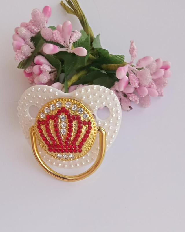 Дитяча соска пустушка біла з червоною короною та бусинами 0+,6+,12+