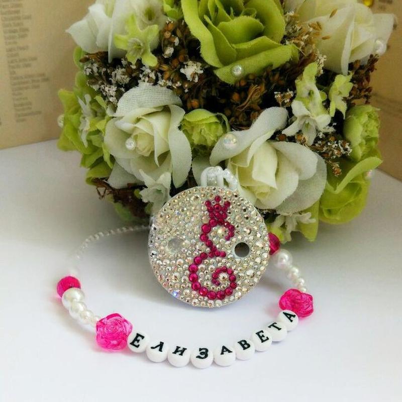 Новорождённый малыш -- это столько счастья и любви, что хочется окружить его не только заботой, но и всем самым красивым. Мамочки покупают самые красивенные костюмчики, шапочки и ползунки, самые милые бутылочки и пустышки. Сосочки-пустышки играют очень большую роль в жизни ребенка, поэтому всегда выбирается самая качественная и привлекательная пустышка. Она находится с малышом самое длительное время, в отличие от одежды, и должна быть хорошей и красивой. Чувство прекрасного развивается в ребенке с первых дней, и яркая красивая сосочка будет радовать и привлекать его внимание. Она не надоест, а станет любимой вещью. А кроме самой пустышки, необходимо, чтобы на ней был прочный и красивый держатель. Клипса-держатель -- это приспособление, которые крепится к пустышке и позволяет вешать её малышу на шею, чтобы не потерять и не уронить. Также, можно повесить на угол кроватки или на стульчик для кормления, чтобы всегда была на виду. В нашей студии хрустального декора мы предоставляем услуги по декорированию стразами детских пустышек и изготовлению именных держателей! Зачем это нужно? Что, если Вы купили самую качественную на свете соску, но она имеет простой дизайн? Обычно, хорошие вещи имеют весьма сдержанный дизайн. А слишком яркие и пестрые, наоборот, могут оказаться не очень хорошими китайскими вариантами. Но каждая мать хочет, чтобы ее малыш пользовался самыми красивыми вещами, но, конечно же, без потери качества! Вот тут на помощь приходит наша идея инкрустации стразами пустышки, в любом дизайне. Можно выложить стразами имя Вашей крохи или любой логотип, например, корону для маленькой принцессы, или машинку для будущего гонщика! Вы получите самую красивую пустышку, и она будет индивидуальной. А к ней мы предлагаем создание соответствующего держателя. Мы изготавливаем именные клипсы-держатели на заказ, из специальных бусин с буковками, из которых выкладываем имя Вашего малыша. Также, украшаем держатель разными яркими бусинами различных форм. Это получается не только оригинально, но и полезно для мелкой моторики рук ребёнка. По всем вопросам, звоните и пишите нам!