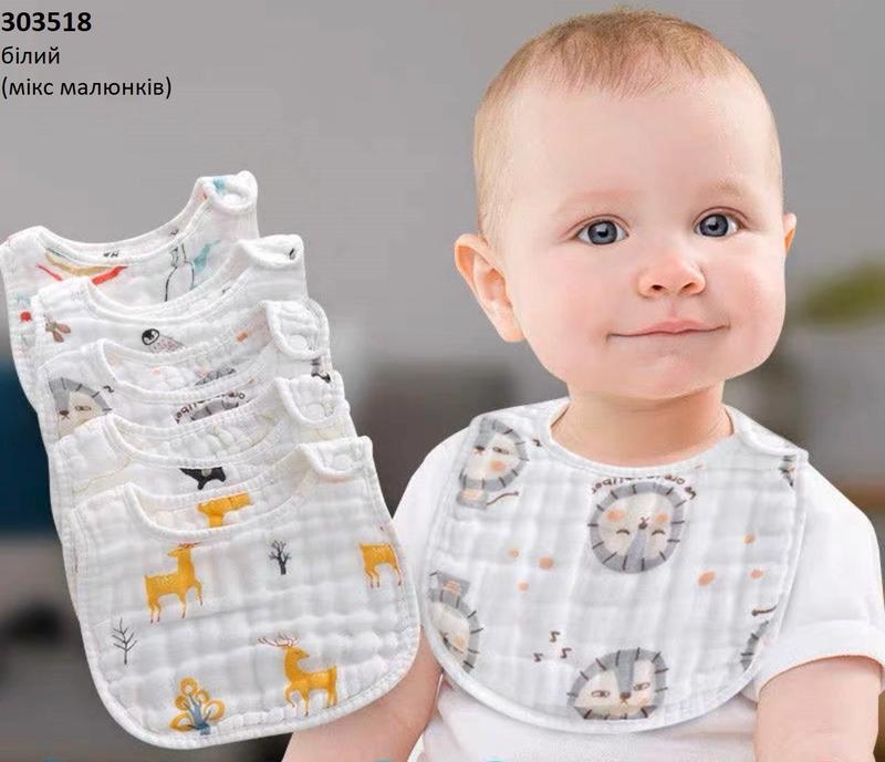 Муслиновый детский нагрудник. С марлевой вставкой. Размер 25*26. на кнопках. Микс узоров. От 3 шт скидка.