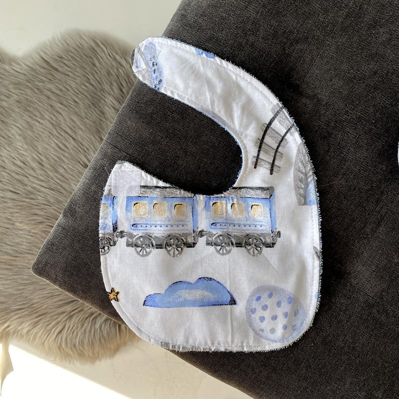 Непромокаемый слюнявчик на липучей застежке с синим поездом от minky home