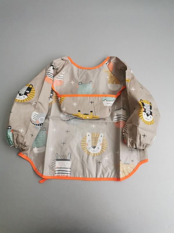 Дитячий слинявчик з довгим рукавом. Спереду має карманчик та клийончасту не промокаючу поверхню. Рукавчики та спинка бавовна Ззаду зав'язується та регулюється Розмір від 12 міс. до 3 років. До зросту 110 см