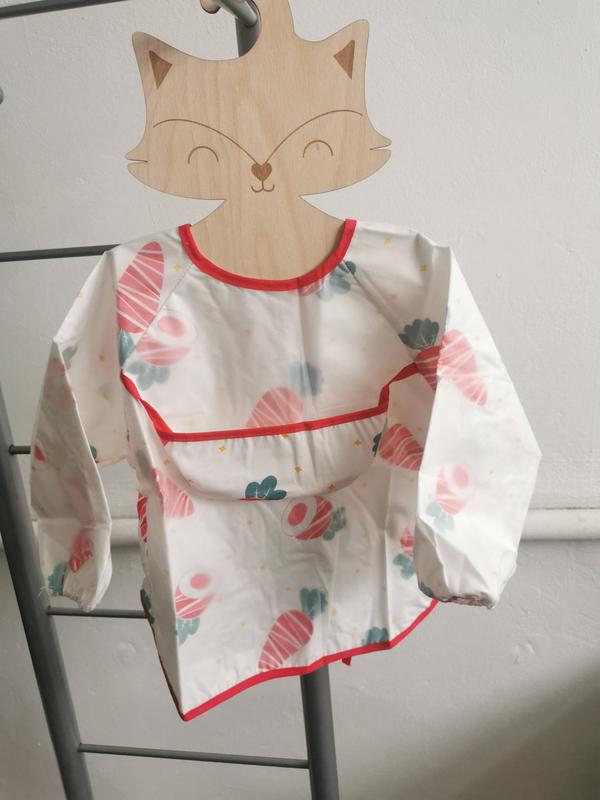 Дитячий слинявчик з довгим рукавом. Спереду має карманчик та клийончасту не промокаючу поверхню. Рукавчик теж захищений, не промокає. Спинка бавовна. Під клийончастою поверхнею теж бавовняна тканина, яка прилягає до тіла малюка. Ззаду зав'язується та регулюється Розмір від 11 міс. до 3 років. До зросту 110 см