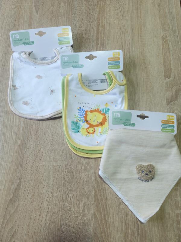Набор слюнявчиков из 3 шт. Слюнявчики треугольной формы с мишкой имеют внутри ткань, которая не пропускает влагу. Набор с животными обычные слюнявчики.
