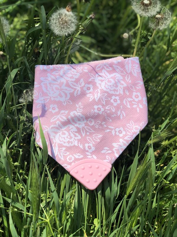 Слюнявчик с грызунком уголком розовый с имитацией кружева