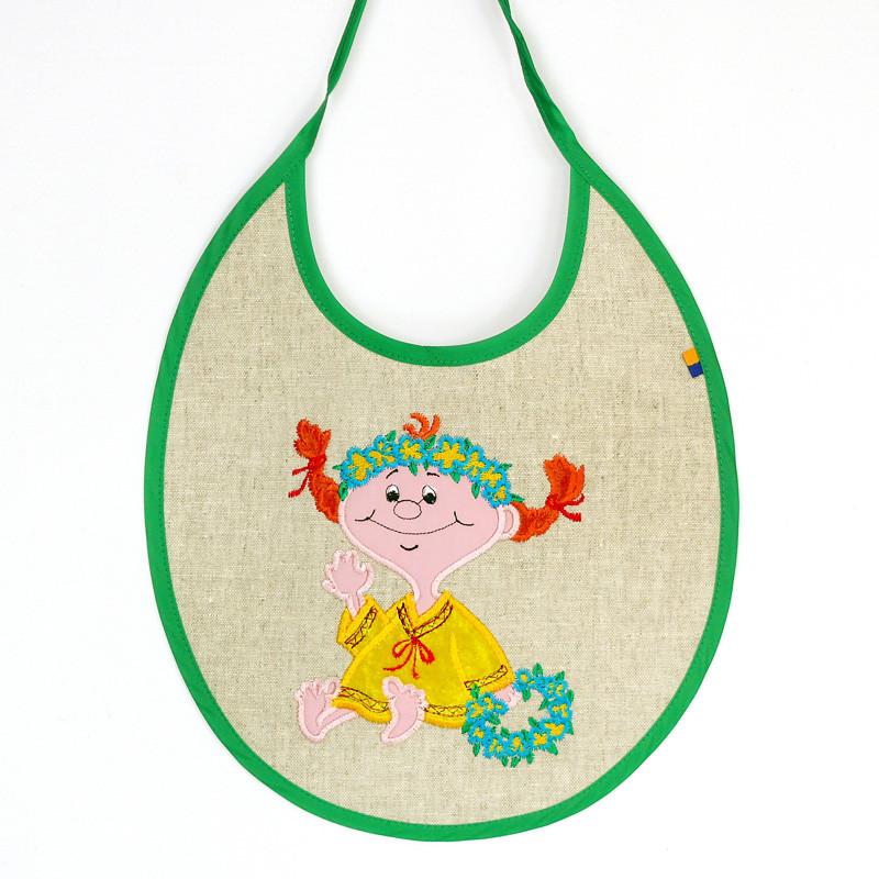 Детский слюнявчик Риженька девушка" изготовлен из льна, завязки и окантовка выполнены из цветной бейки. Изображение на слюнявчиках - аппликация в виде красивых картинок, которые обязательно понравятся Вашим деткам. Размер слюнявчика 24х28 см.