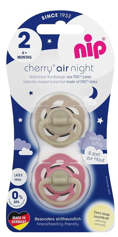 Пустушка nip® Cherry Air Night розмір 2 (від 6 місяців) Латекс це натуральний продукт медового кольору з молочного соку каучукового дерева. Завдяки своїй особливо високій еластичності він дуже міцний і стійкий до розриву. Всмоктувальна частина не стає статично зарядженою, тому менше притягує пилу та ворсинок. - З повітряною лінзою на ніч - Соски виготовляються з FSC® сертифікованого натурального каучукового латексу - Сяє інтенсивно та довго - У приглушених сучасних кольорах - За зразком мамінічних грудей - Ідеально поєднується з грудним вигодовуванням - З кільцем для надійного утримання - 0% BPA Світиться в темряві довго і інтенсивно Великі вентиляційні отвори в диску пустушки дозволяють великій кількості повітря досягати ніжної шкіри дитини. Заокруглений край захищає від точок тиску Кругла всмоктувальна частина Створено за зразком грудей матері та особливо зручно для грудного вигодовування ]]>