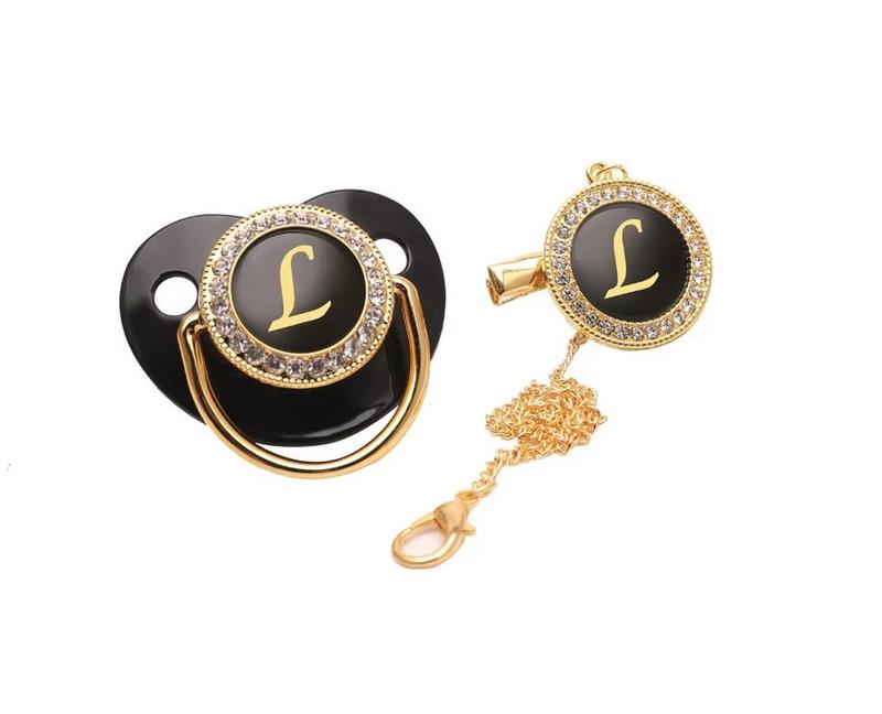Буква L В наличии соска-пустышка черного цвета с буквами, сияющими камешками, зажим с цепью. Без вредных веществ. Не рекомендуется кипятить через камешки.