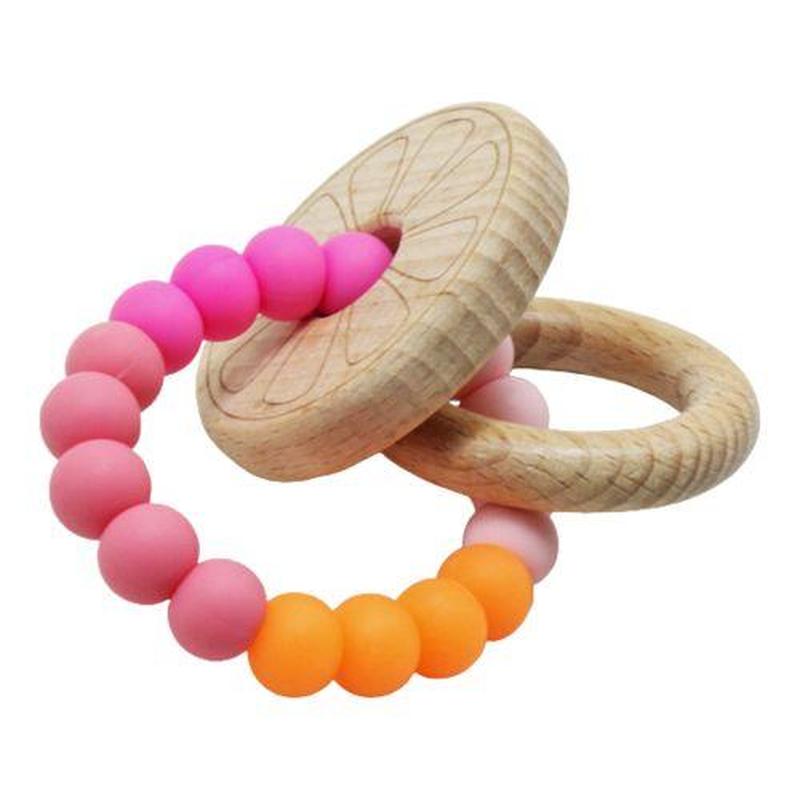 Прорізувач силіконовий абсолютно безпечний для малюка. Виконаний у вигляді браслетика з гумовими намистинами та дерев'яними кільцями, що гримлять. Дитина зможе самостійно тримати іграшку навіть однією рукою. Допоможе зняти дискомфорт під час прорізування зубів. Сприяє концентрації уваги, розвиває дрібну моторику, тактильні відчуття, координацію рухів та сприйняття кольорів. Упаковка: Пакет Колір: Помаранчевий. рожевий Вага з упаковкою: 50 г Габарити в упаковці: 3 x 15 x 10 см Габарити без упаковки: 6 x 9.5 x 7 см Країна виробник: Китай Матеріал: Гума,дерево Комплектація: Прорізувач-брязкальце