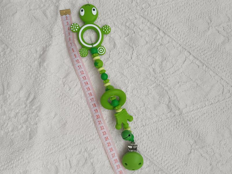 Это аксессуар, предназначенный для крепления соски или прорезывателя к одежде ребенка, чтобы предотвратить его падение или потерю. Изготовлен из безопасных для детей материалов, из пищевого силикона. Может служить также в качестве прорезывателя благодаря наличию бусин и элементов, которые можно грызть.