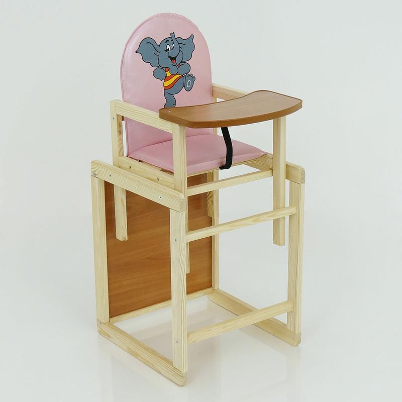 Дитячий дерев'яний стільчик для годування. Виріб виконаний з дерева. Стільниця ламінована, світла, широка. Сидіння покрито шкірзамом. Трансформується в маленький стіл-стільчик. Розмір: - Довжина (см):45 см - Ширина (см):43 см - Висота (см):97 см Упаковка: Пакет