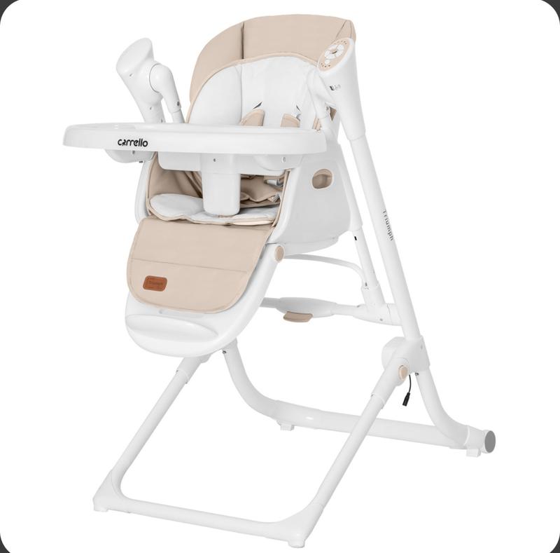 Carrello Triumph - многофункциональный стульчик для кормления 3в1. Стульчик сочетает в себе три функции: стульчик для кормления, шезлонг и качели с автоматическим бесшумным движением. Гибкость регулировки обеспечивает комфорт для малыша в любом положении, а функции органически дополняют друг друга. Стульчик для кормления Carrello Triumph легко превращается в закачивающий центр: достаточно опустить сиденье вниз и нажать кнопку для снятия блокировки качания. В режиме качели Triumph работает как от сети, так и от обычных батарей, что позволяет использовать его в любом месте. Таймер для укачивания устанавливается на 8, 15 и 30 минут, обеспечивая необходимое время для успокоения малыша.