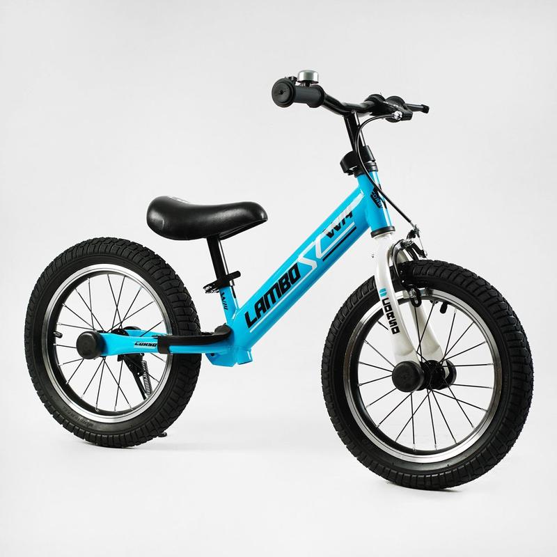 Велобіг CORSO LAMBO (LB-14802), сталева рама, ручне гальмо, колеса надувні резинові 14'', алюмінієві обода, підставка для ніг, підніжка, дзвоник. Велобіг "Corso" стане наступним кроком після толокара до дорослого двоколісного велосипеда! Яскравий велобіг з барвистими написами оснащений зручним сидінням, великими колесами і міцною рамою, що дає змогу його використовувати тривалий час і забезпечує малюкові комфортне безпечне катання. Рама і кермо цієї моделі виконані з міцної сталі. Колеса біговела надувні, а сидіння виготовлено зі шкірозамінника. Сидіння регулюється за висотою, що дасть змогу підлаштувати велобіг під кожну дитину індивідуально. Характеристики: Довжина велобіга - 90 см; Ширина керма - 39 см; Колеса - 2 надувних колеса, діаметр - 14". Особливості: - ручне гальмо - сталеве кермо - підставка для ніг - підніжка - дзвіночок на кермі Вага велобіга - 4 кг. Максимально допустиме навантаження - 30 кг. Упаковка: Коробка
