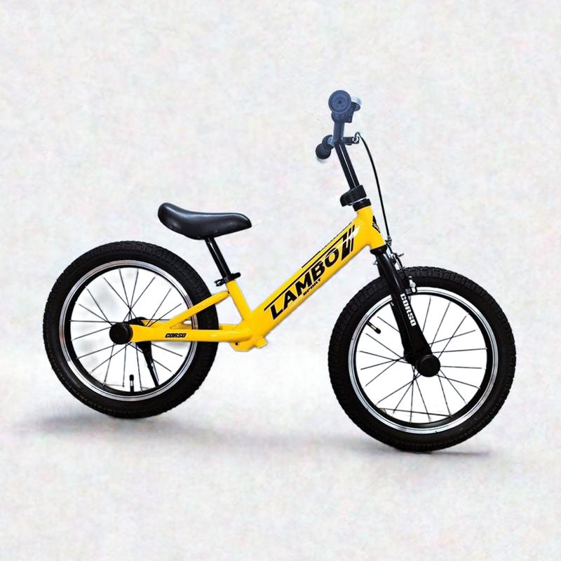 Велобег "Corso 16" станет следующим шагом после толокара к взрослому двухколесному велосипеду! Яркий велобег с красочными надписями оснащен удобным сиденьем, большими колесами и крепкой рамой, что позволяет его использовать длительное время и обеспечивает малышу комфортное безопасное катание. Рама и руль этой модели выполнены из прочной стали. Колеса беговела надувные, а сиденье изготовлено из кожзама. Сидение регулируется по высоте, что позволит подстроить велобег под каждого ребенка индивидуально. Характеристики: Длина велобега - 95 см; Ширина руля - 39 см; Колеса - 2 надувных колеса, диаметр - 16". Особенности: - ручной тормоз - стальной руль - подножка - колокольчик на руле Вес велобега - 4 кг. Максимально допустимая нагрузка - 30 кг.