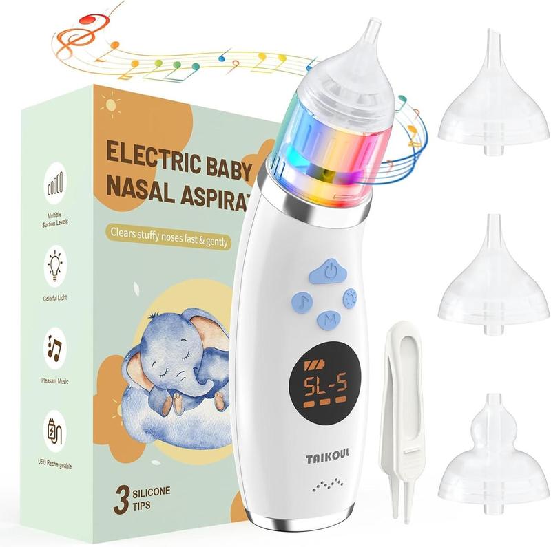 5 регулируемых уровней всасывания, подходящих для разных нужд: наш детский назальный аспиратор имеет 5 уровней всасывания, сильный режим -- до 70 кПа, для разных возрастных групп и разной заложенности носа. Удобство и безопасность: детский назальный аспиратор предназначен для новорожденных, малышей, младенцев и детей и оснащен тремя многоразовыми силиконовыми насадками. мягкий и не раздражающий, поэтому не повреждает слизистую оболочку носа ребенка. Подходит для детей разного возраста и состояния. Функция света и музыки: Если у вашего ребенка заложен нос, он беспокойно и даже начинает плакать. Детский назальный аспиратор оснащен приятной музыкой и успокаивающими световыми эффектами, которые могут хорошо отвлечь вашего ребенка и позволить вам использовать удобную функцию очистки, которую вы можете включать и выключать в зависимости от состояния вашего ребенка. Водонепроницаемая конструкция IPX6 и самоочищающаяся конструкция: технология глубокой очистки, запускаемая одной кнопкой, быстрая очистка машины, хост можно промывать напрямую, а входящую в комплект небольшую щеточку можно использовать для легкой очистки инструмента. Основной корпус назального аспиратора имеет степень водонепроницаемости IPX6 и защищен от брызг бытовой воды (однако погружение в воду строго запрещено). Компактный, портативный и перезаряжаемый: электрический детский назальный аспиратор имеет небольшие размеры и поставляется с футляром для хранения, что позволяет легко брать его с собой, когда вы выходите на улицу. Перезаряжаемый, обеспечивает 120 минут работы после полной зарядки. Это идеальный подарок на рождение ребенка, Рождество и дни рождения. Идеально подходит для предметов первой необходимости для новорожденных. (Внимание: назальный аспиратор не работает во время зарядки.)