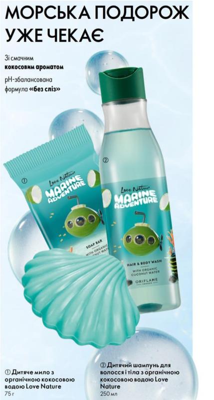 Детский шампунь для волос и тела с органической кокосовой водой Love Этот нежный шампунь для волос и тела приглашает каждого ребенка погрузиться в волны с ароматом кокоса. Мягкая и нежная формула подходит для детей С органической кокосовой водой и ярким ароматом кокоса Объем 250 мл Детское мыло с органической кокосовой водой Love Nature Это нежное мыло с ароматом кокоса приглашает каждого ребенка исследовать подводный мир. 1. Мягкая и нежная формула подходит для детей 2. С органической кокосовой водой и ярким ароматом кокоса срок 2026 г.