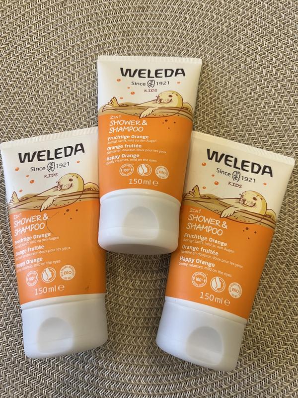 Виготовлено в Швейцарії .Обʼєм 150 мл, оригінал, новий . Веселе купання з ароматом апельсина, без сліз і ризику подразнення Дитяча шкіра набагато тонша за нашу, тому потребує більш дбайливого догляду. Шампунь і крем для душу 2 в 1 Weleda Happy Orange з ніжними очисними інгредієнтами й натуральним складом збагачений апельсиновою та кунжутною оліями. Він підтримує природні функції шкіри, не щипає очі й перетворює щоденне прийняття ванни у веселу розвагу. Властивості: ніжно очищає дитячу шкіру та волоссячко не обтяжує дитячу шкіру, підтримує її природні функції потішить теплим ароматом апельсина з нотками ванілі робить шкіру м’якою та пружною чудово підходить для дітей віком від 3 років не подразнює шкіру та не щипає очі Склад: веганський склад схвалено дерматологами кунжутна олія — джерело ненасичених жирних кислот, фітостеринів і вітаміну Е, має антиоксидантну дію, доглядає за шкірою олія апельсина Спосіб застосування: Нанесіть шампунь і крем для душу 2 в 1 Weleda Happy Orange на вологу шкіру чи волосся, спіньте круговими рухами, а опісля ретельно змийте водою.