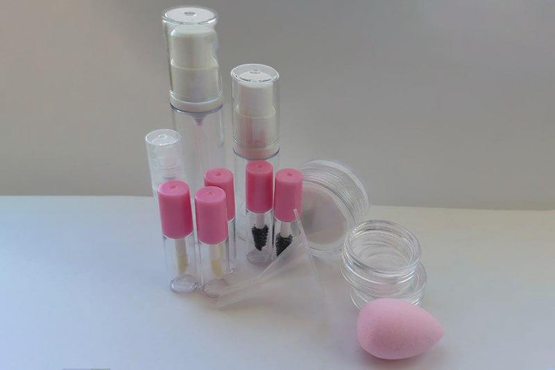 Мини набор для путешествий В набор входит 9 предметов: 1. Мини диспансер вакуумный 5 мл - 1 шт 2. Мини диспансер вакуумный 10 мл - 1 шт 3. Распылитель 2 мл - 1 шт 4. Емкость с аппликатором 1.2 мл - 3 шт 5. Емкость с щеточкой 1.2 мл - 2 шт 6. Круглые баночки 3 г - 2 шт 7. Баночка для пудры со спонжиком 5 г - 1 шт 8. Мини спонжик - 1 шт 9. Мини лейка - 1 шт Габарити косметички : 13х13 см