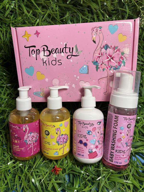 Бокс дитячий «Фламінго» До набору входить: -пінка для вмивання 3+ -гель для інтимної гігієни 3+ дитячий шампунь-гель для душу 3+ -дитяче молочко для тіла 1+