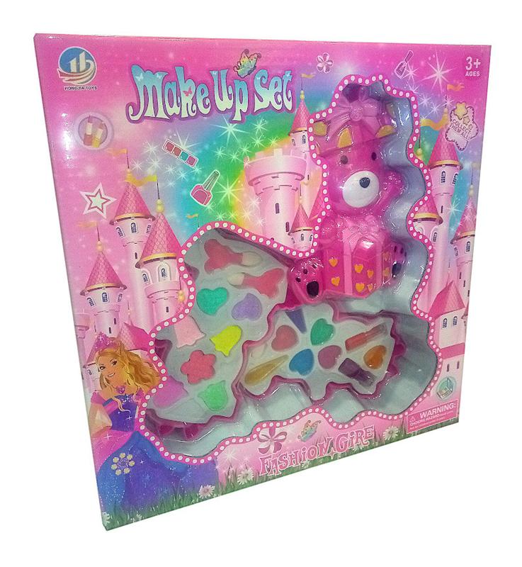 Детская декоративная косметика "Make up set" в форме мишки с подарком состоит из двух ярусов: 1. Кремообразный бальзам для губ семи цветов и кисточка для их нанесения, две помады разных цветов 2. Сухие тени семи цветов и спонжик для их нанесения Косметика компактно складывается в мишку, которого удобно носить с собой