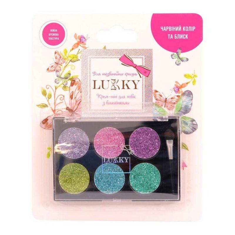 Крем-тени для век Lukky 6 оттенков с блестками создадут неповторимый образ для девочки. Подойдет для юных модниц. Тени светло-голубых и синих оттенков дополнены блестками. Текстура кремовая и абсолютно безопасна для детской кожи. В наборе: 6 оттенков теней для век; аппликатор. Рекомендовано для детей от 6-ти лет.